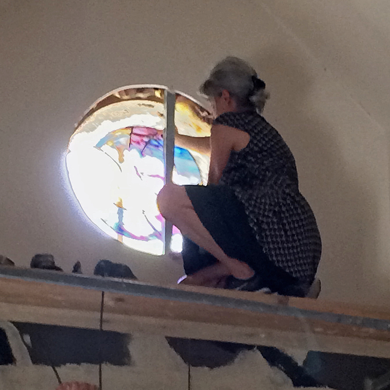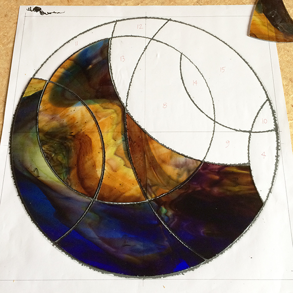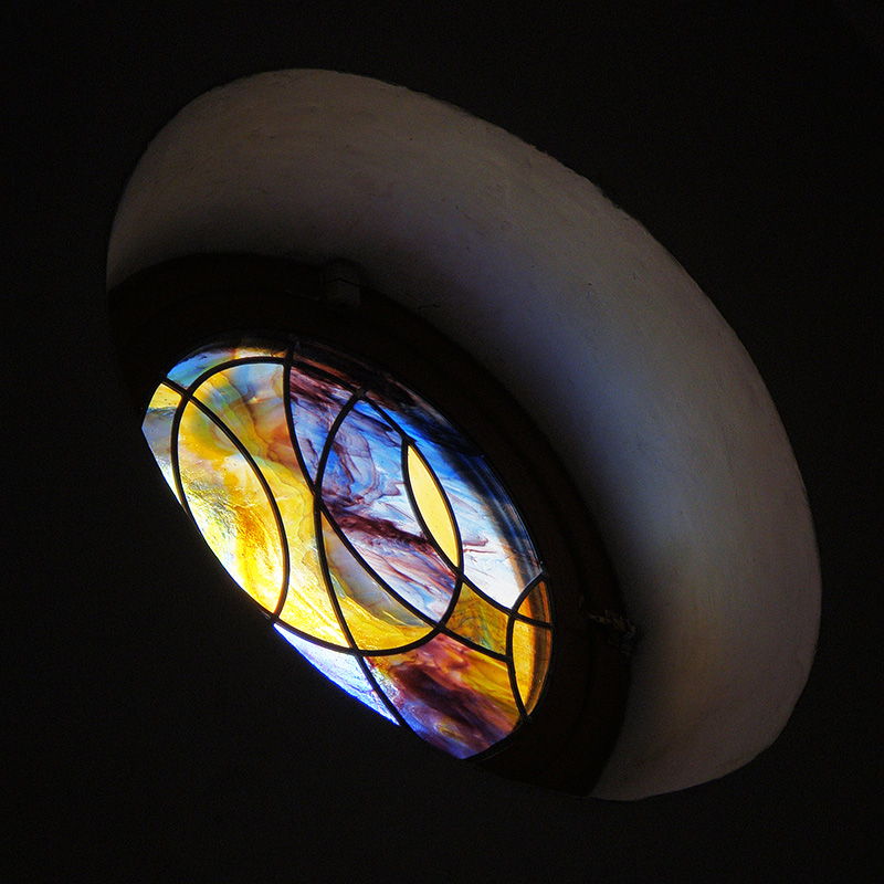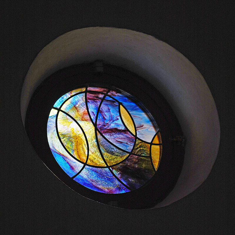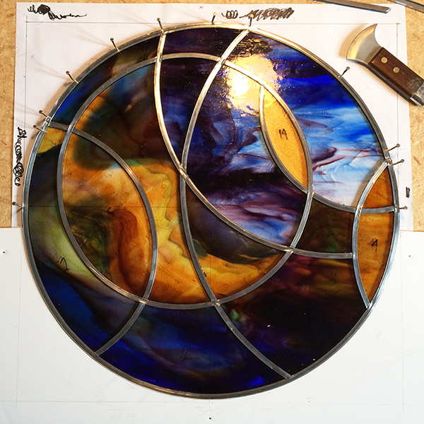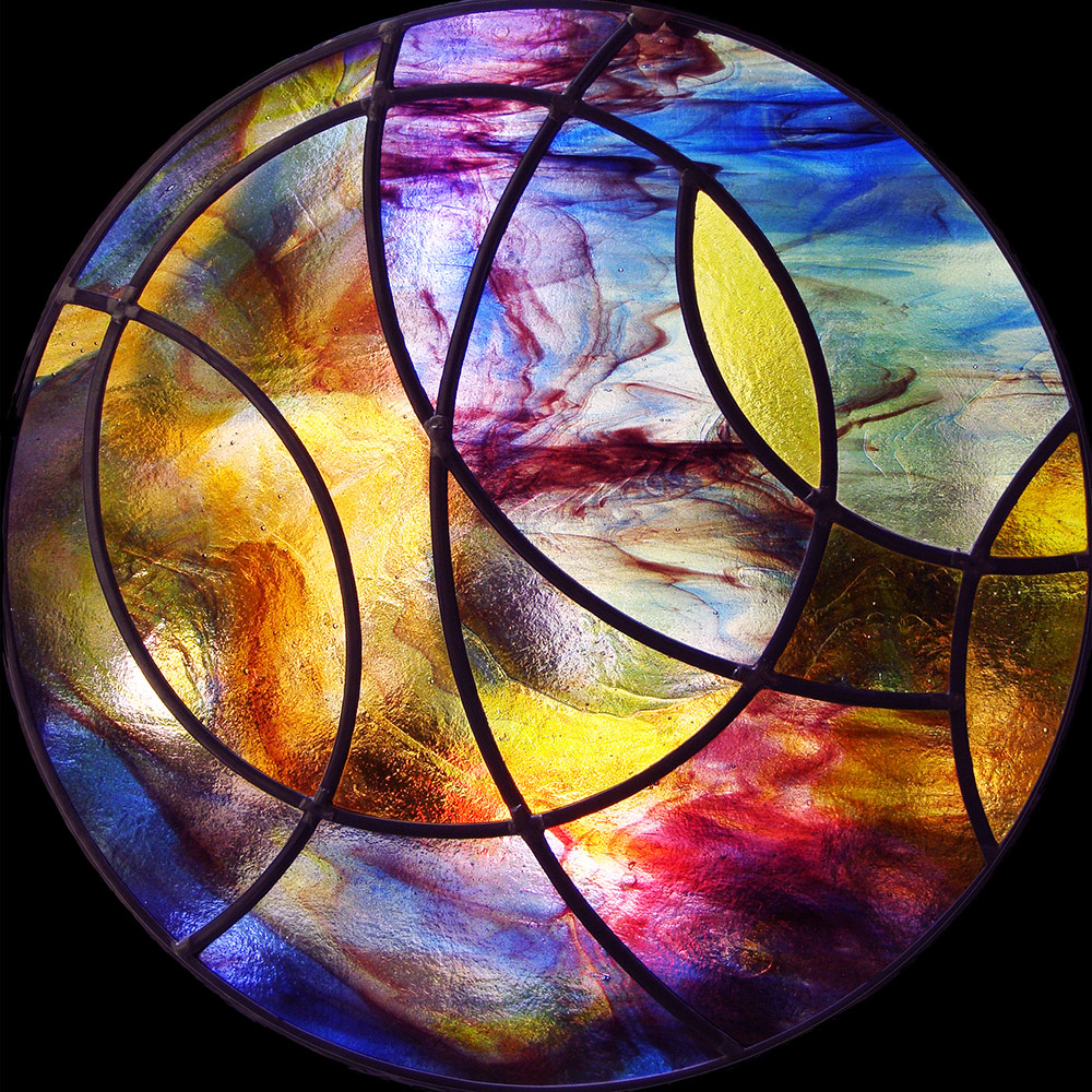 Ce vitrail est une commande d’un particulier résidant dans l’Yonne. J’ai souhaité réunir dans cette forme ronde les différents éléments: l’air, le feu, l’eau et la terre, sous la forme d’un tracé assez sobre. J’ai utilisé des verres chamarrés américains qui ont la particularité d’être des feuilles uniques et qui offrent des effets de couleur et de matière très intéressants.